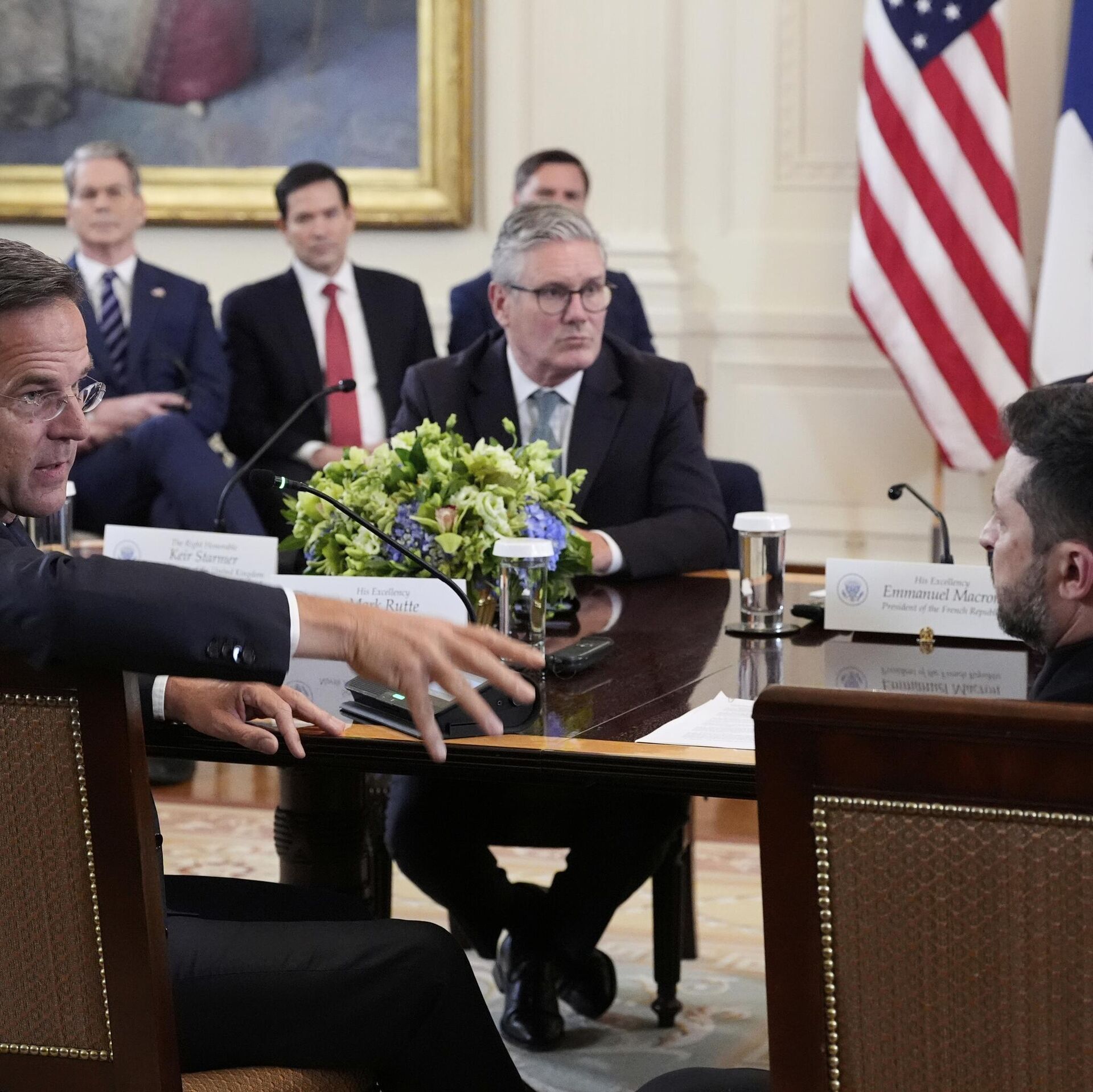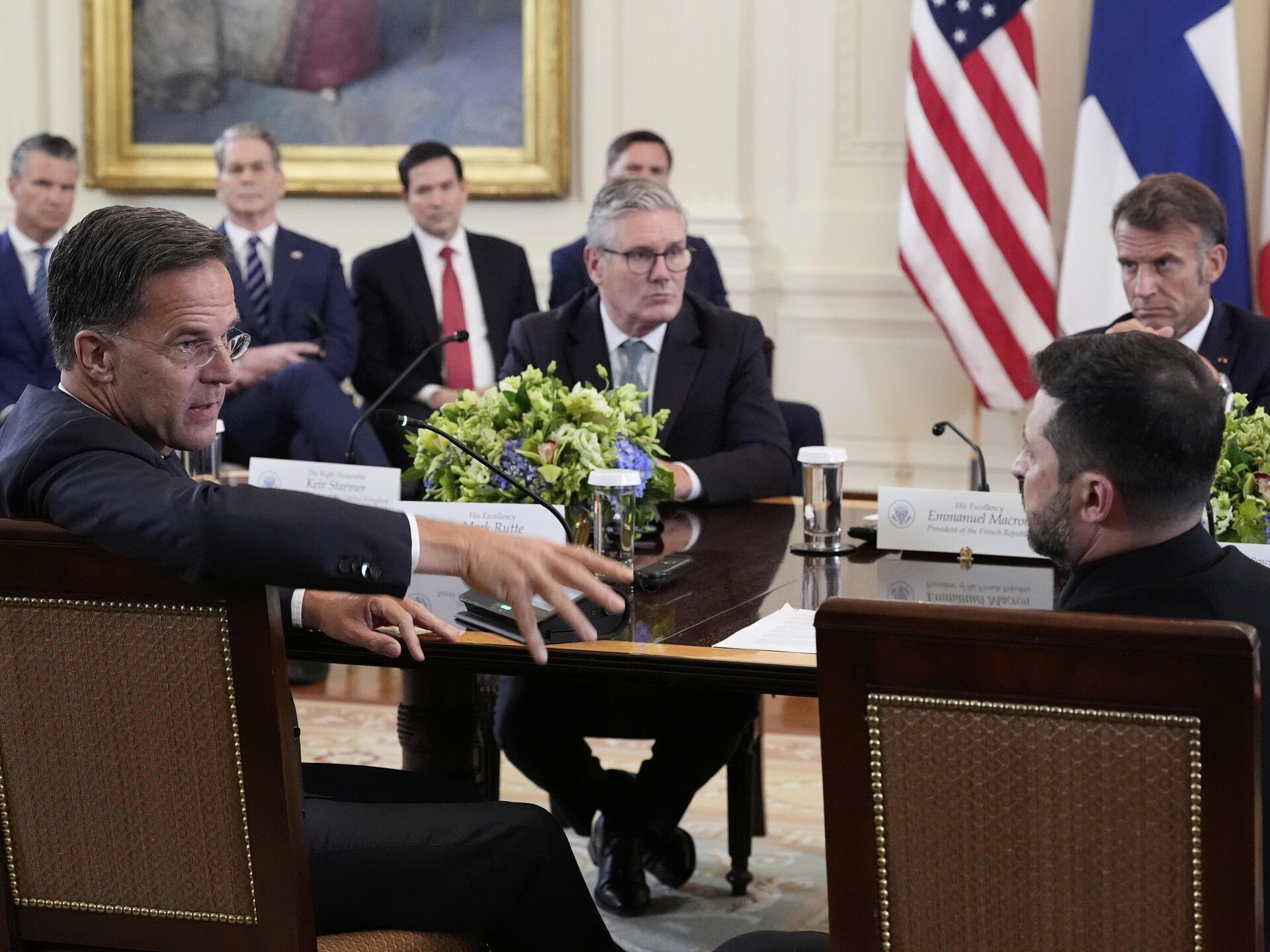 © AP Photo / Alex BrandonNATO Secretary General Mark Rutte, foreground left, speaks as Ukrainian President Volodymyr Zelenskyy, foreground right, British Prime Minister Keir Starmer, center left, and France's President Emmanuel Macron, center right